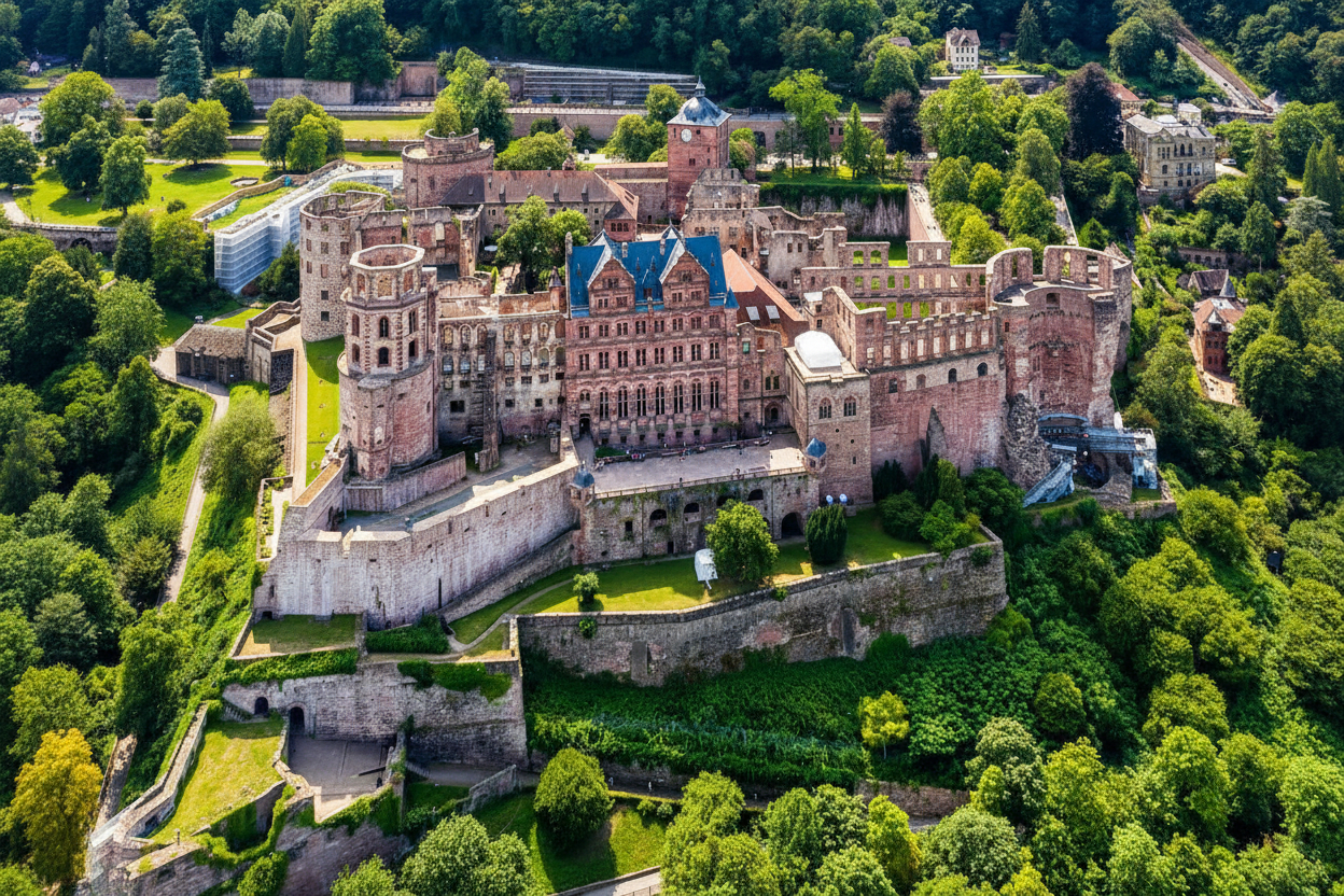 ネッカー川を見下ろす高台に佇むハイデルベルク城は、ドイツ・ロマン主義の象徴です。戦争で破壊されたままの姿を留める「滅びの美」が、世界中の人々を惹きつけます。城内には22万リットル超の巨大ワイン樽や薬事博物館など見どころが満載。バルコニーから仰ぐ旧市街の赤レンガのパノラマは、まさに息を呑む絶景です。